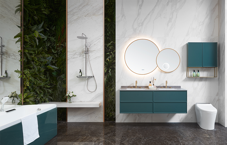 从满足用户便利的卫浴生活方式出发,结合光、电、智能、便利等元素,致力于打造一个人性化的浴室空间。该定制空间主色采用波兰高雅绿搭配浅金色五金,一种高级又隐秘复古的时尚轻奢风。