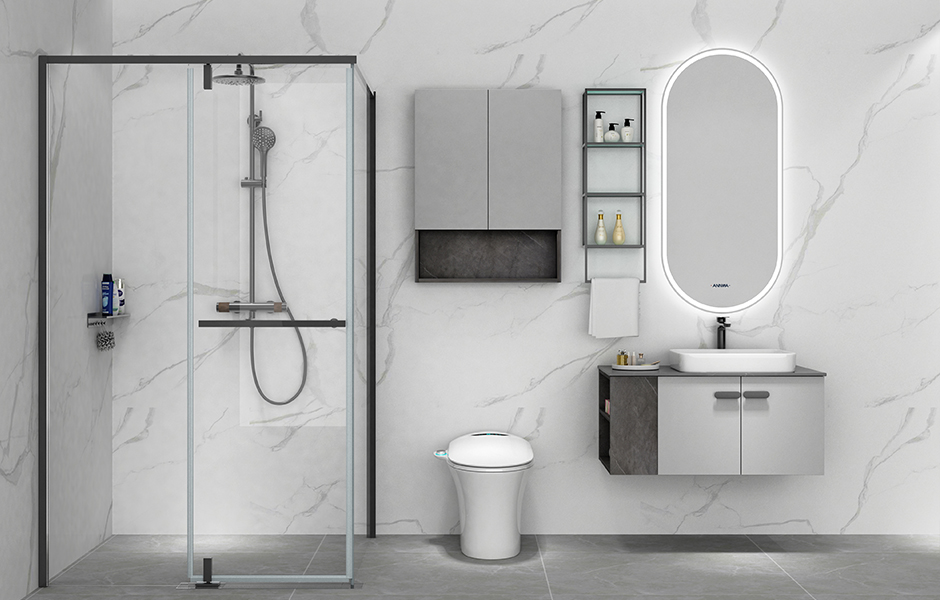 1.主柜门板+抽屉结合,合理分类收纳;双盆设计,方便两人同时使用。 2.镜子带灯光,一键照明;镜子带防雾功能,一键除雾。 3.金属置物架,放置常用洗漱用品。 4.大容量侧柜,可放置浴袍、换洗衣物、备用物品等等。 5.马桶上方功能柜,放些纸巾、备用物品等。 6.岩板台面,坚固不易刮花。